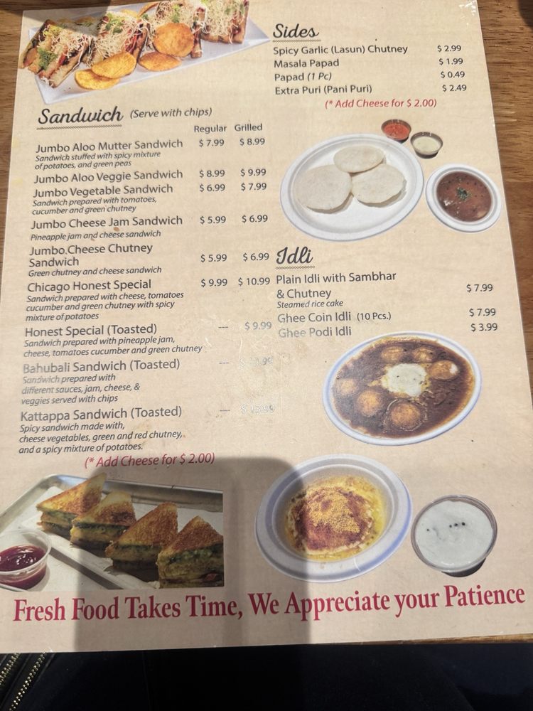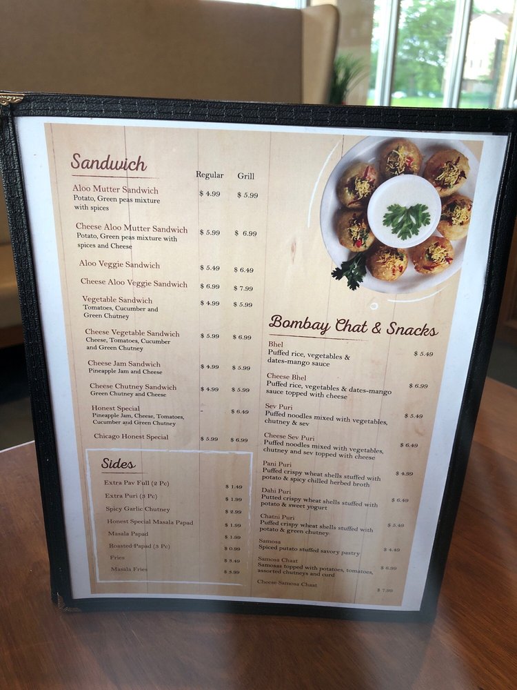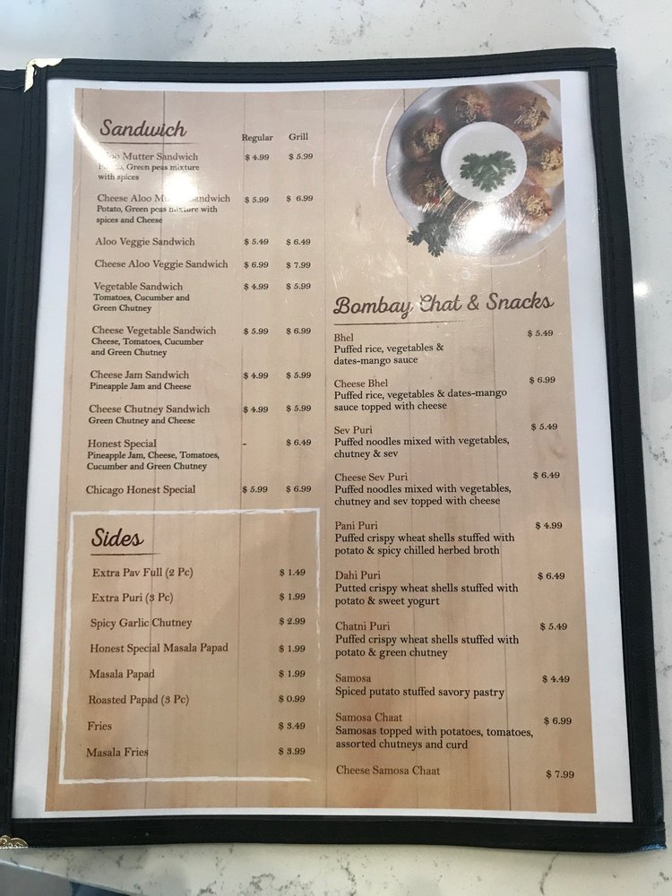Honest, an Indian restaurant located in Naperville, IL, offers a diverse menu with vegan and vegetarian options. Customer reviews highlight their exceptional Pav Bhaji, flavorful Dosa varieties, and delicious chaat. The spacious setting is suitable for family gatherings and casual meals. The ambiance is family-friendly but can get loud on weekends. Service may be slower during peak times, but the food quality makes up for any delays. Standout dishes include the Pav Bhaji, Mixed Uthappam, and Bahubali sandwich. Prices are reasonable, and portions are generous. While dine-in is recommended for optimal freshness, takeout options are available. Overall, Honest delivers a satisfying Indian dining experience, earning a high rating for its flavorful dishes and affordable prices. Make sure to visit when craving authentic Indian street food in the Chicago suburbs!